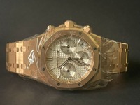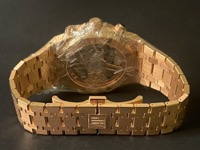 The Audemars Piguet Royal Oak Selfwinding Chronograph 50th Anniversary edition, reference 26240OR.OO.1320OR.03, is a distinguished timepiece that showcases the brand's commitment to craftsmanship and design. Introduced in 2022 to commemorate the 50th anniversary of the Royal Oak collection, this model features a 41 mm case crafted from 18-carat pink gold, paired with a silver-toned "Grande Tapisserie" dial. The watch is powered by the self-winding Caliber 4401, visible through the sapphire caseback, which also reveals the special "50-years" oscillating weight.