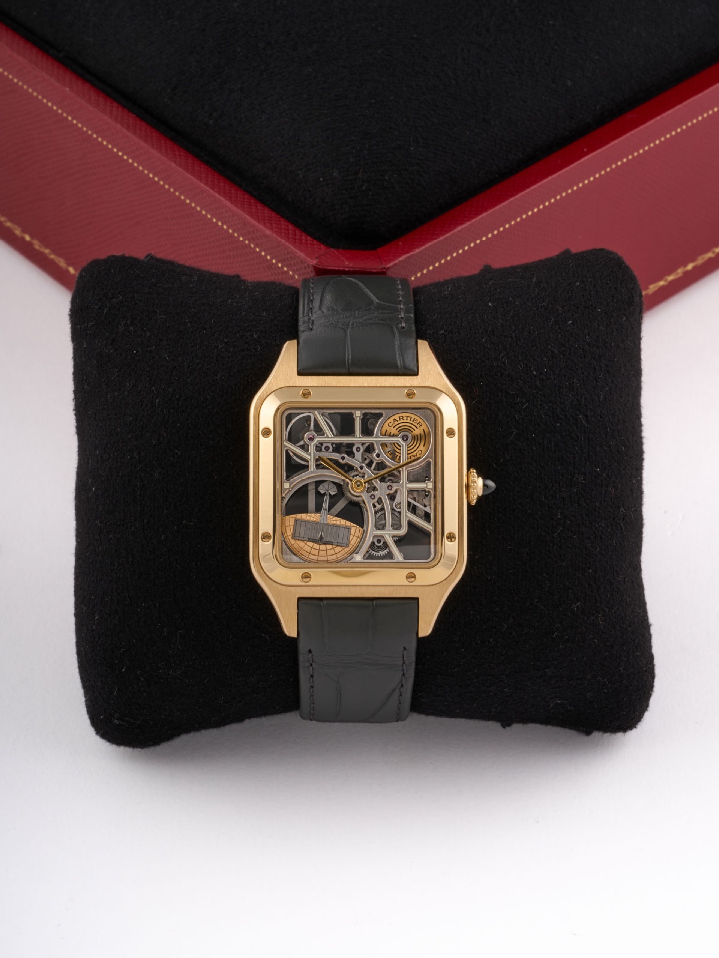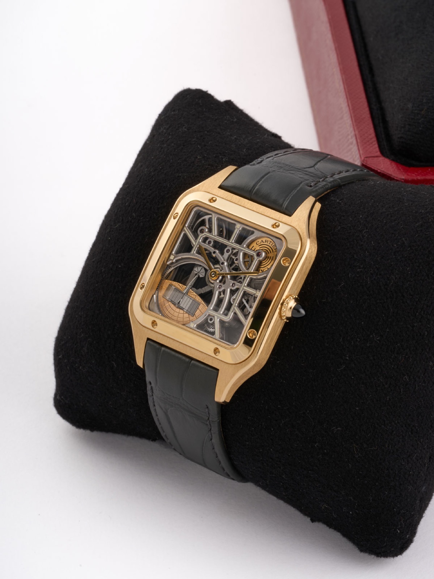 The Cartier Santos‑Dumont Micro‑Rotor Skeleton in Yellow Gold (Ref. WHSA0043) is a striking blend of fine watchmaking and elegant design. The skeleton bridges double as hour markers and tell time beautifully using blued-steel sword hands. The minimalist design retains legibility without traditional indices. The tiny plane-shaped rotor adds an elegant nod to aviation history, the Watchmaker community notes it’s subtle enough to be tasteful rather than gimmicky.