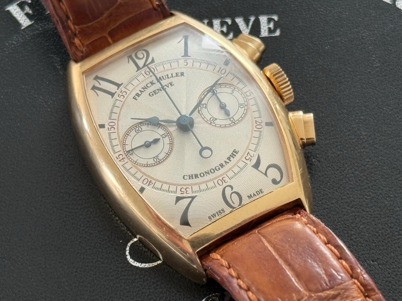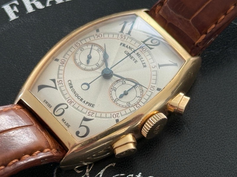 Il cronografo Franck Muller Casablanca 5850 CC DF presenta una cassa tonneau in oro rosa 18 carati da 32x45 mm con quadrante guilloché argentato, numeri arabi e lancette in acciaio azzurrato. Animato dal calibro 1870 a carica manuale, offre precisione ed eleganza svizzera. Completato da un cinturino in pelle marrone e fibbia ad ardiglione in oro rosa, questo segnatempo è perfetto per i collezionisti che ricercano stile e artigianalità.