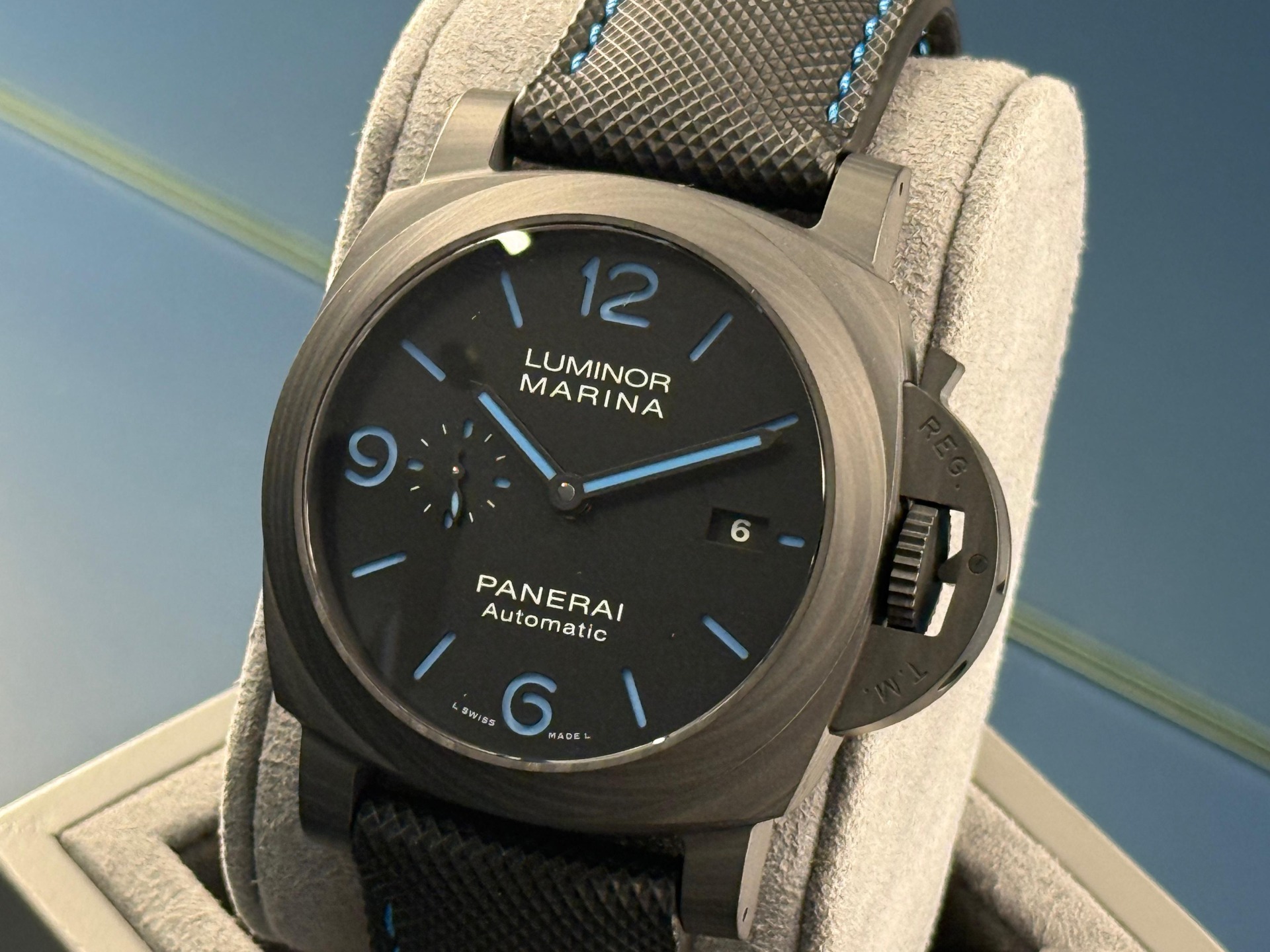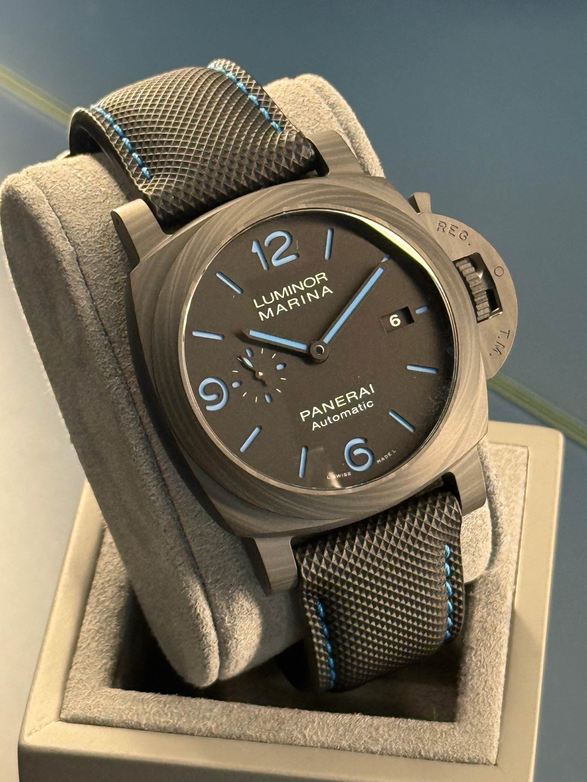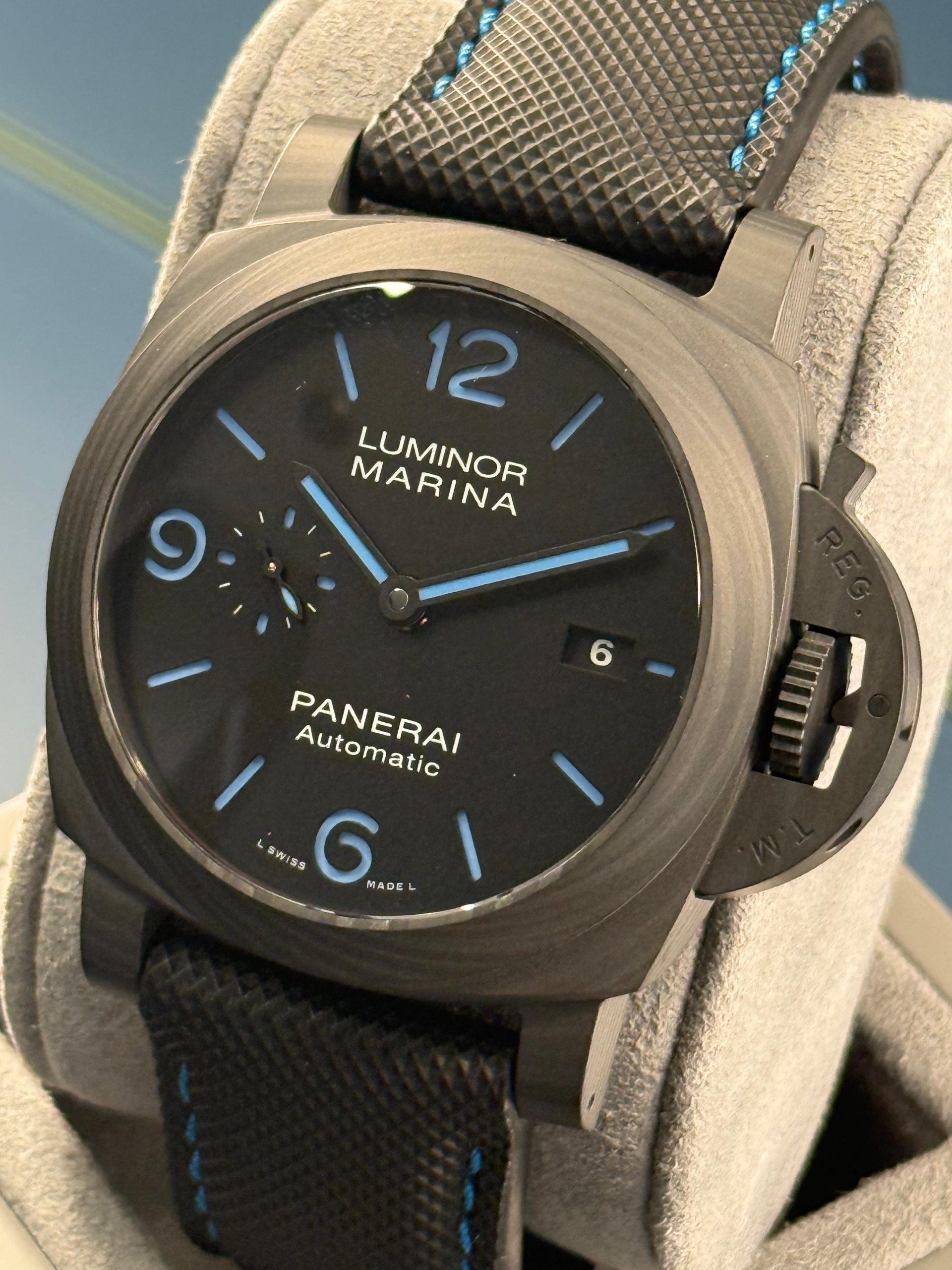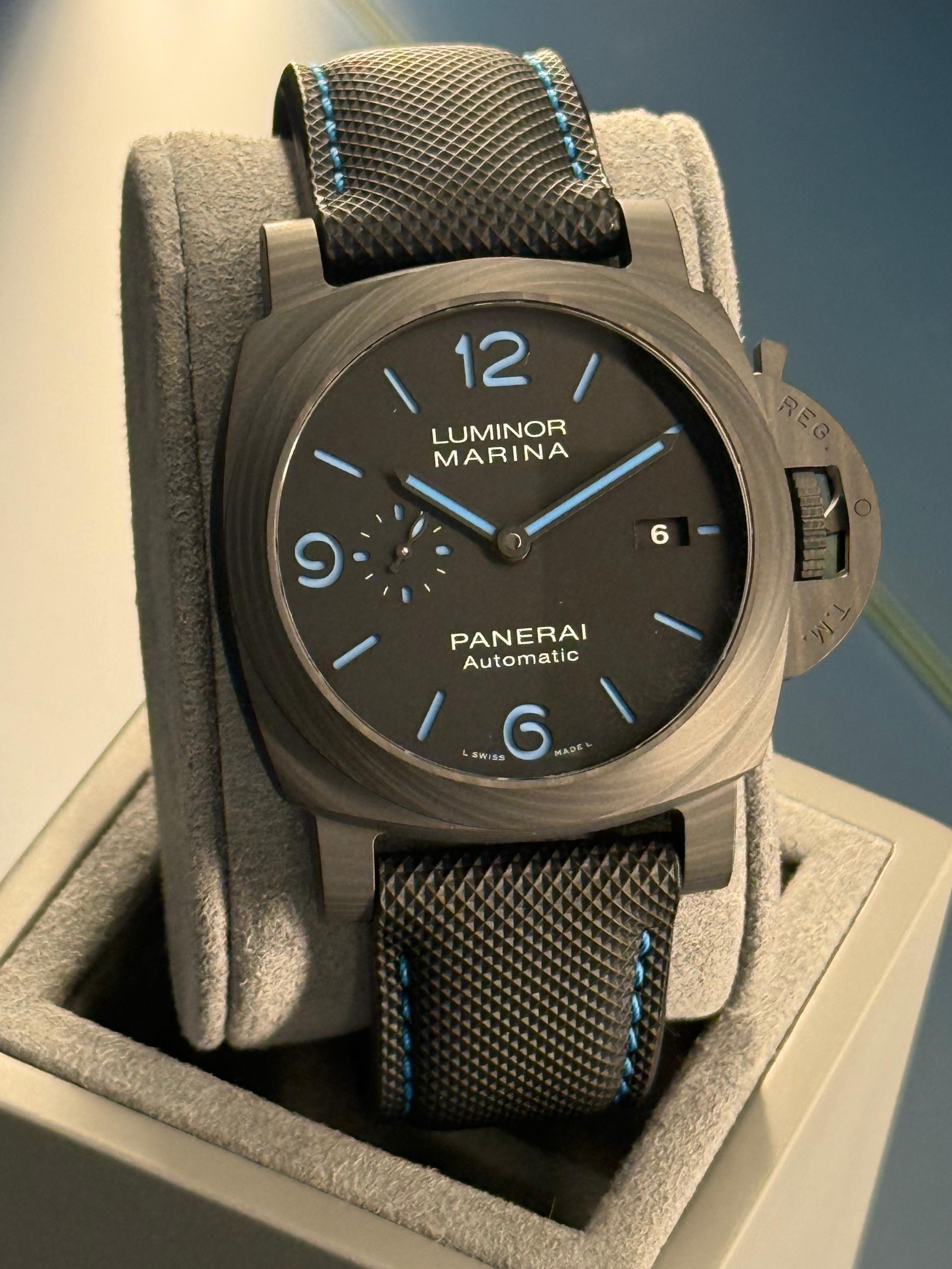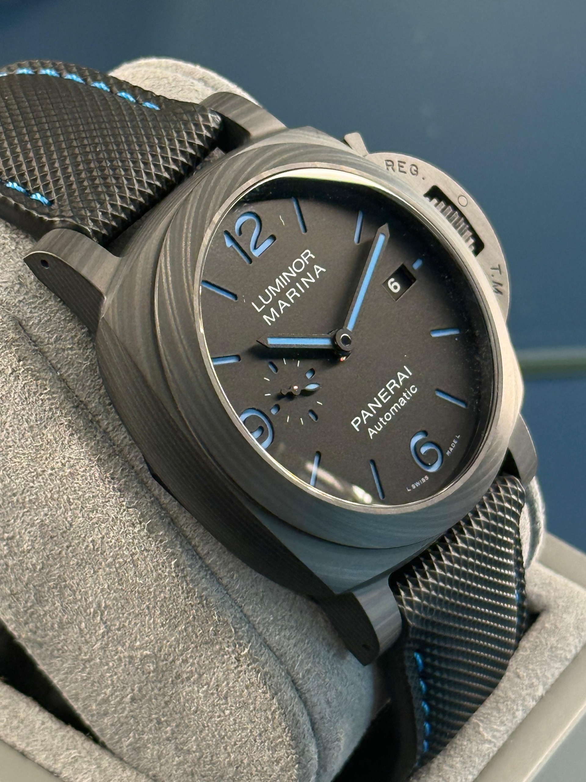 Panerai aveva già realizzato un Luminor Marina in Carbotech, ma questo modello presenta un quadrante diverso.