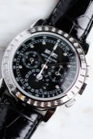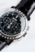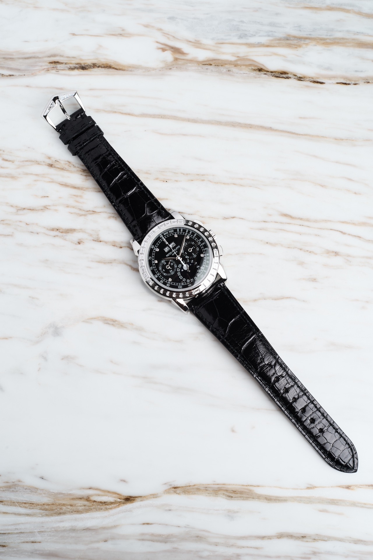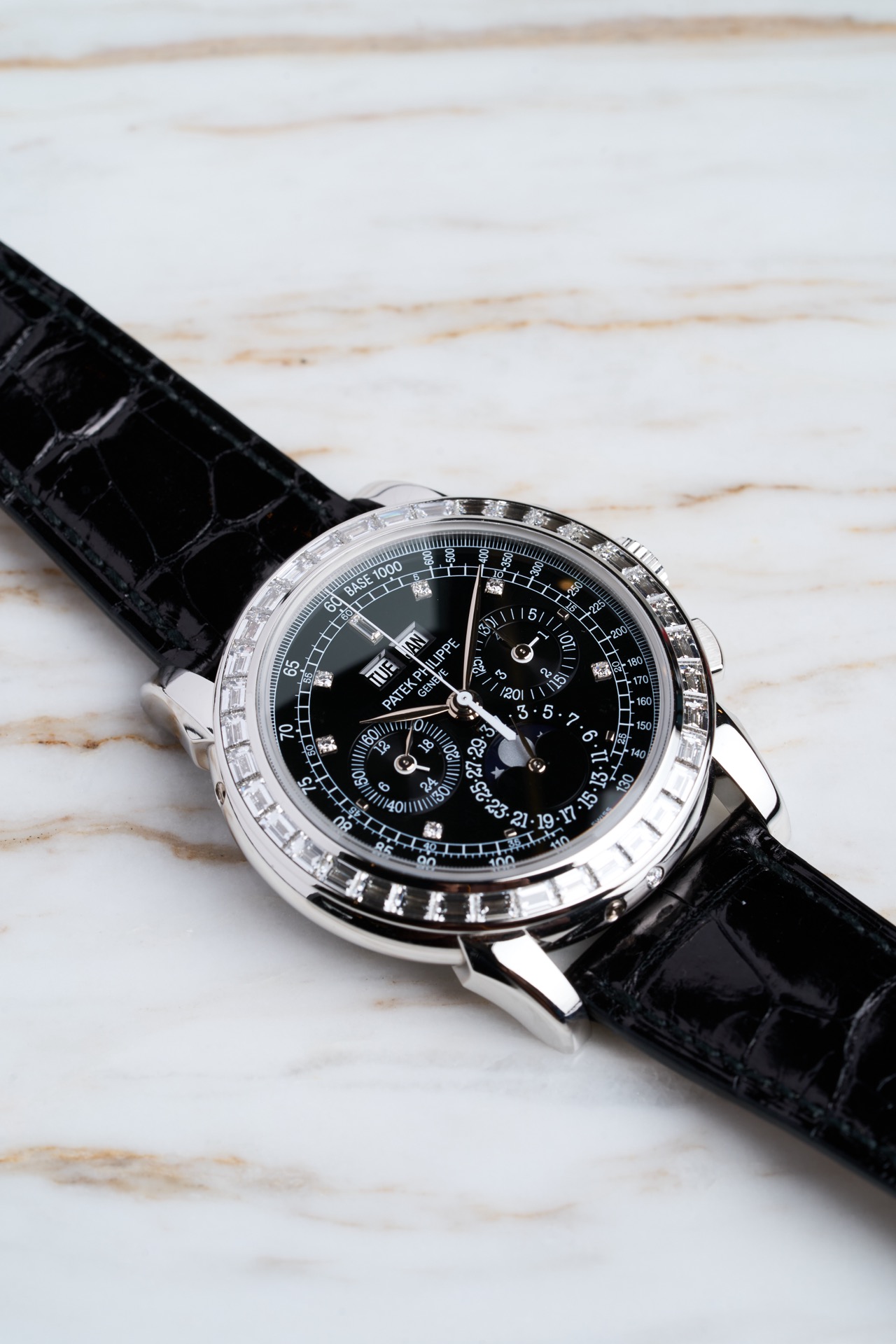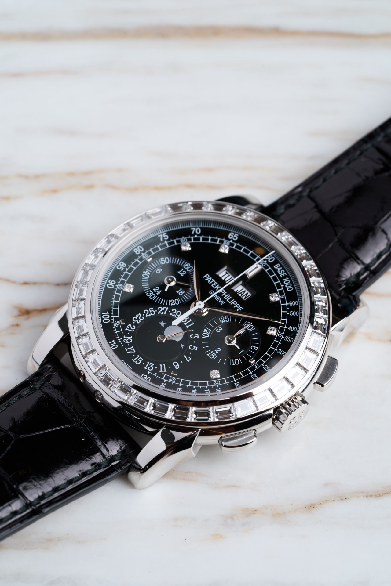 The Patek Philippe 5971P-001 is an ultra-luxurious, highly collectible timepiece that merges high horology with high jewelry. It is a platinum-cased perpetual calendar chronograph adorned with baguette-cut diamonds, a symbol of opulence and technical mastery.