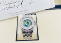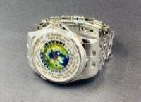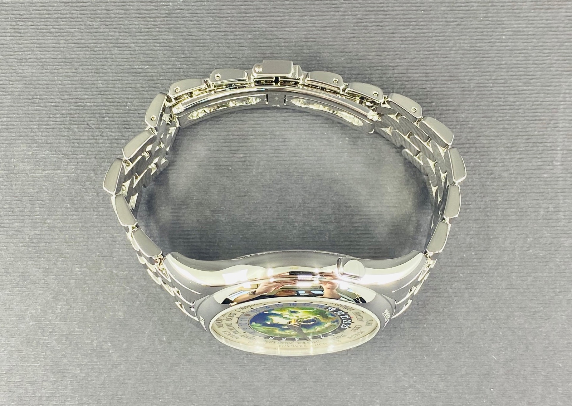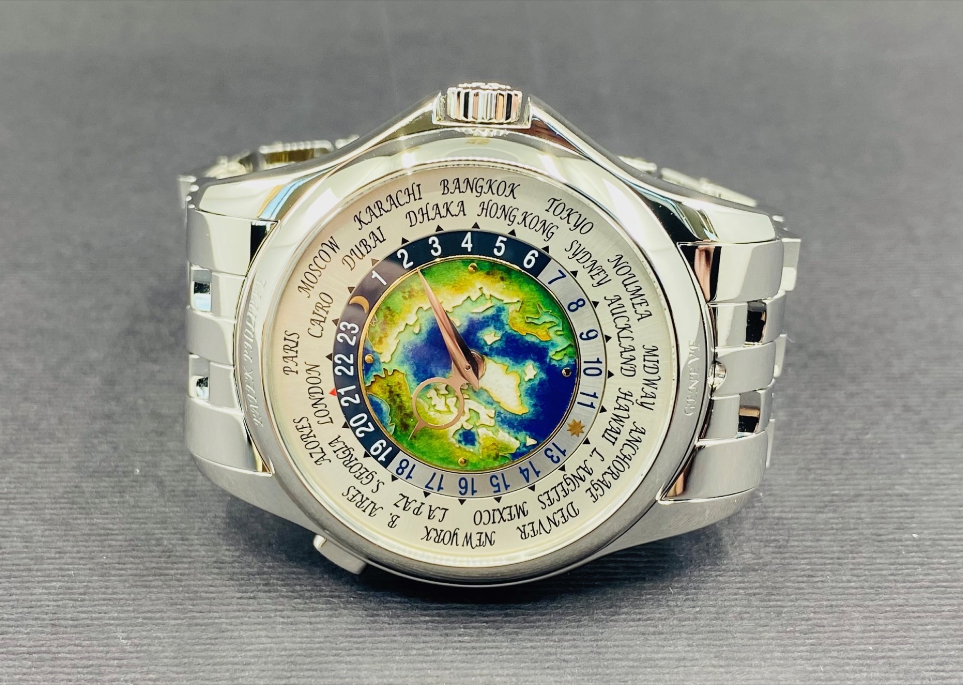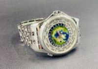 Patek Philippe Complications Platinum World Time 5131/1P-001 featuring a stunning hand-crafted cloisonné enamel world map dial, this exceptional timepiece is housed in 950 platinum with a matching bracelet. A true collector’s icon, it displays all 24 time zones with effortless elegance and precision.