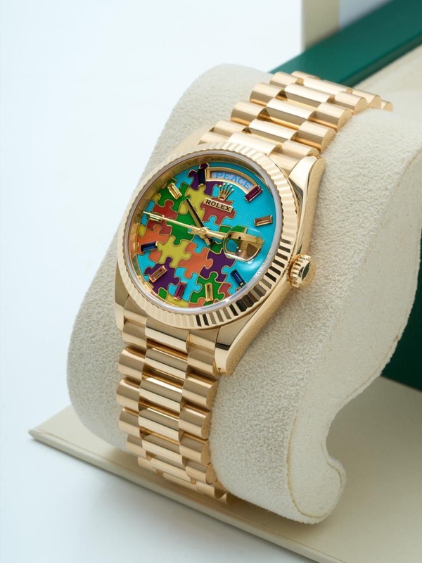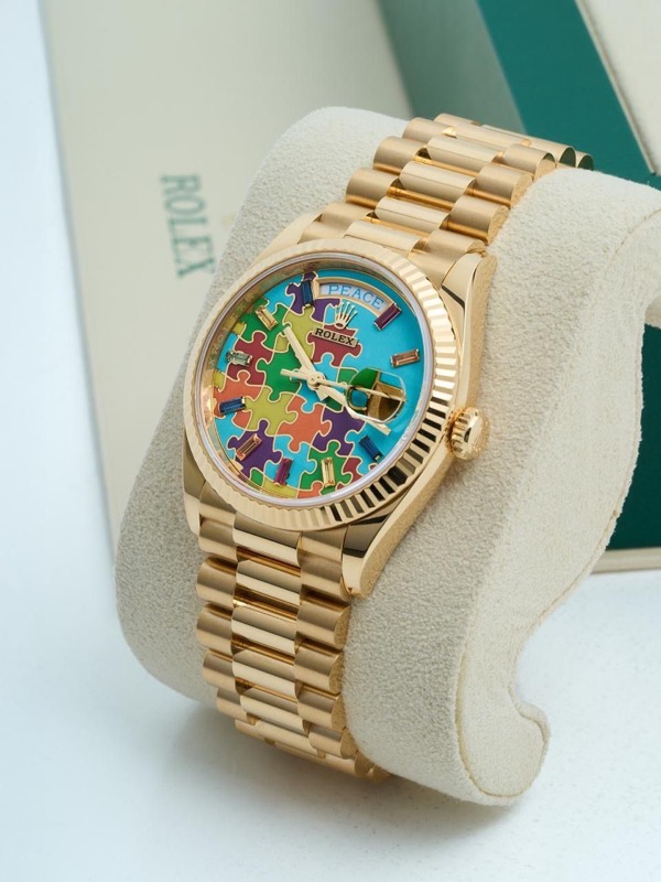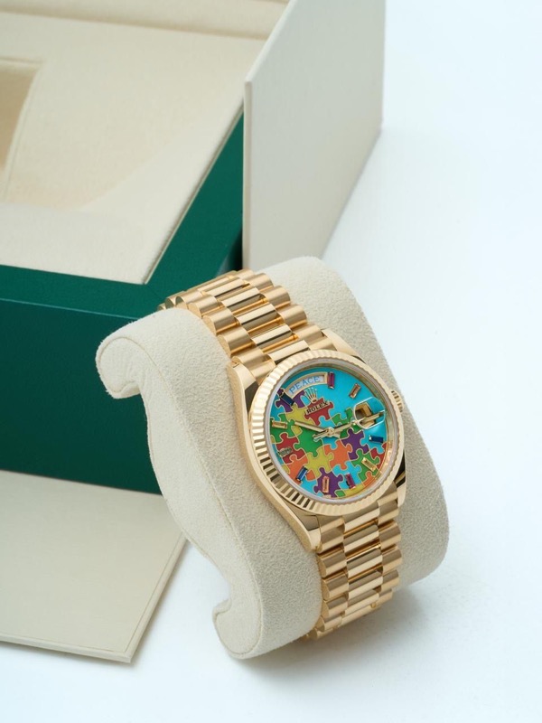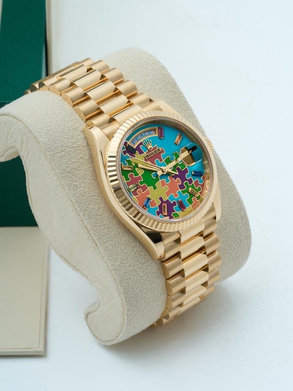 Il Rolex Day-Date 36 Jigsaw Puzzle Dial in oro giallo – Referenza 128238 è una delle espressioni più giocose e vivaci della collezione Day-Date, che fonde il prestigio che contraddistingue Rolex con un design del quadrante audace e non convenzionale.