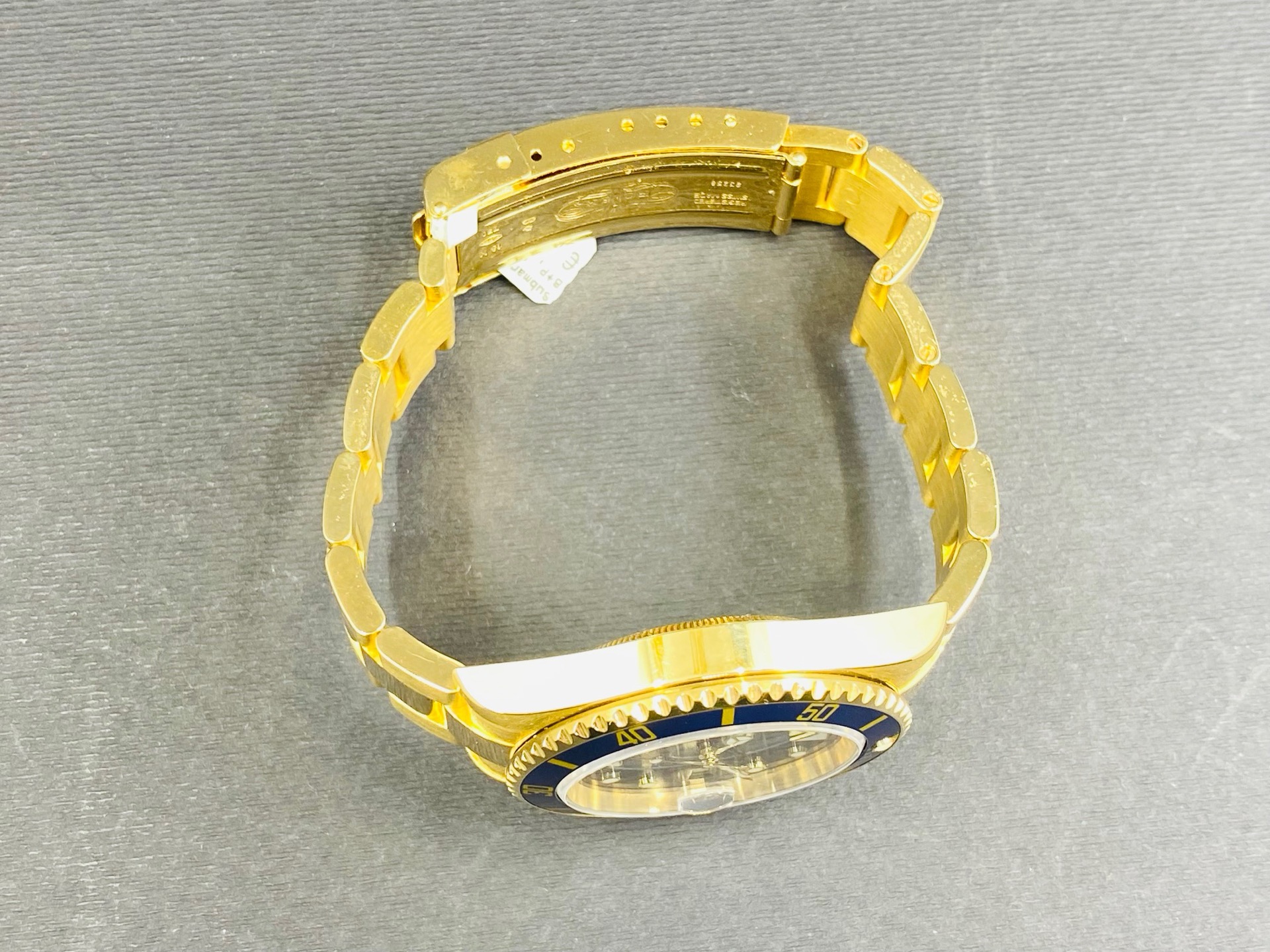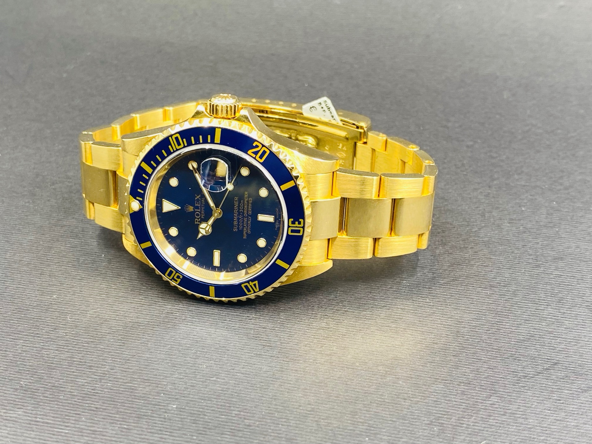 The Rolex Submariner Date Reference 16618 is a luxury dive watch that combines rugged underwater performance with the prestige and elegance of solid 18k yellow gold. It’s a standout piece in Rolex’s lineup, particularly sought after for its rich blue dial and matching blue bezel — a colorway often nicknamed “Bluesy” in collector circles