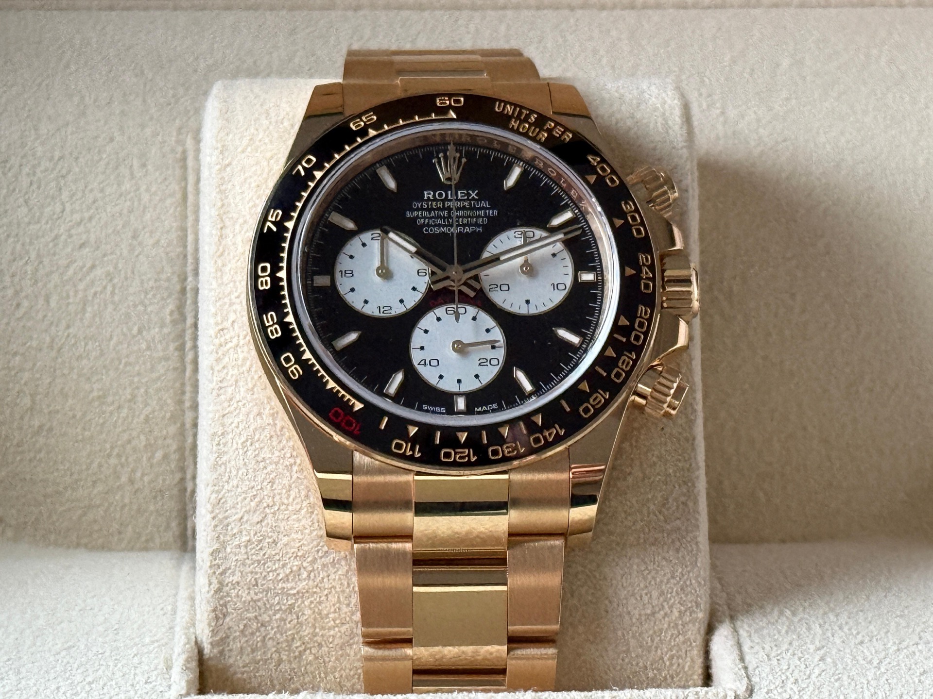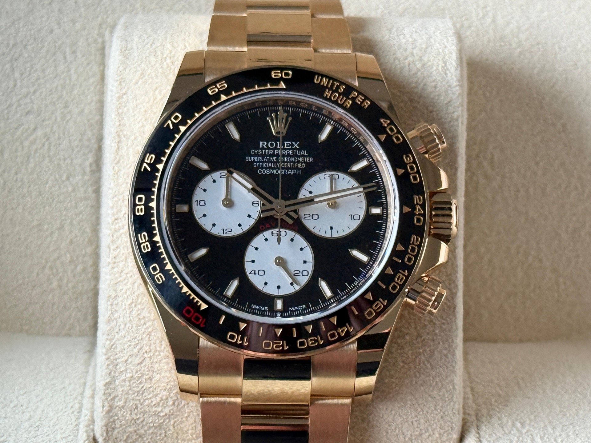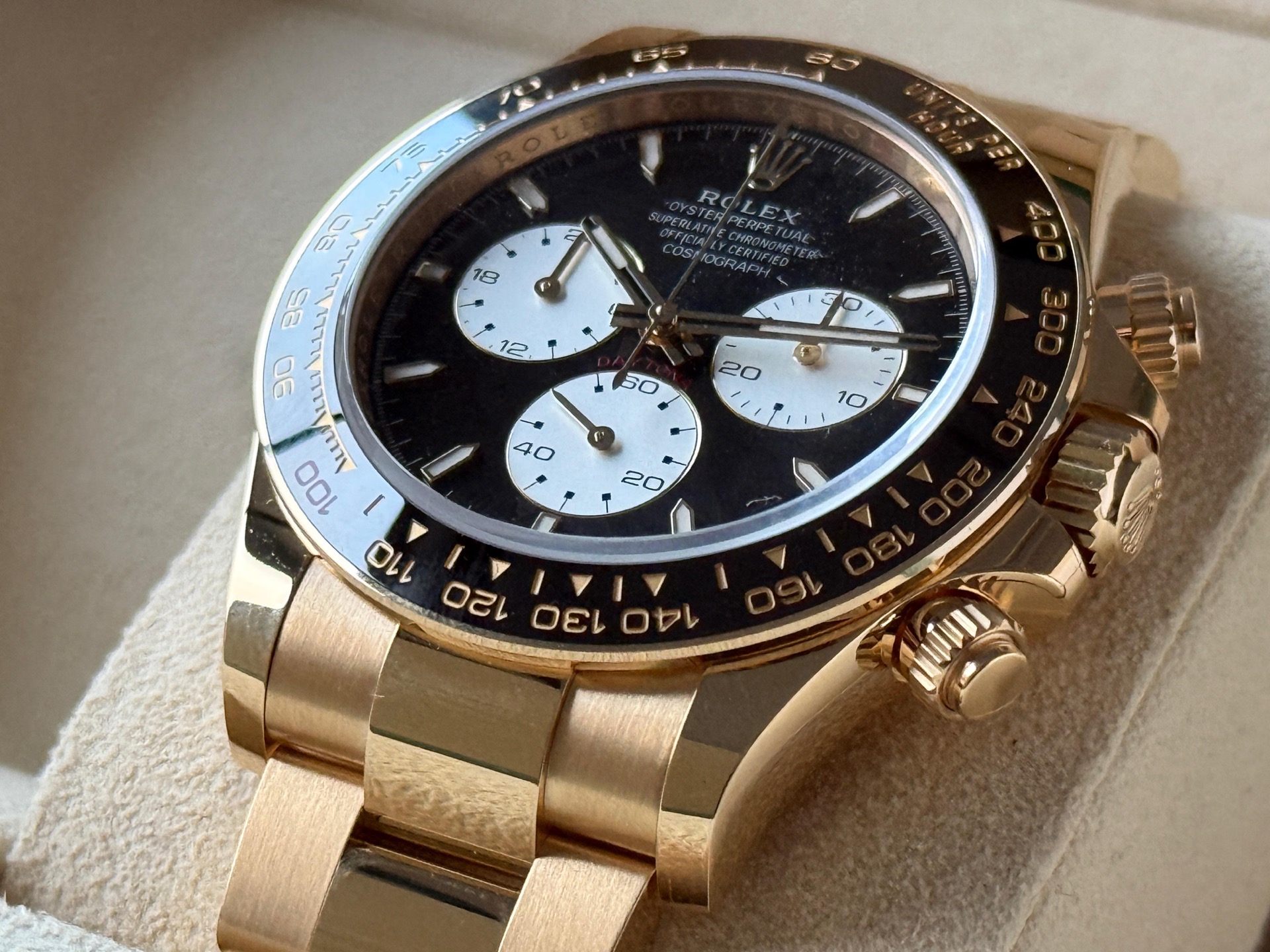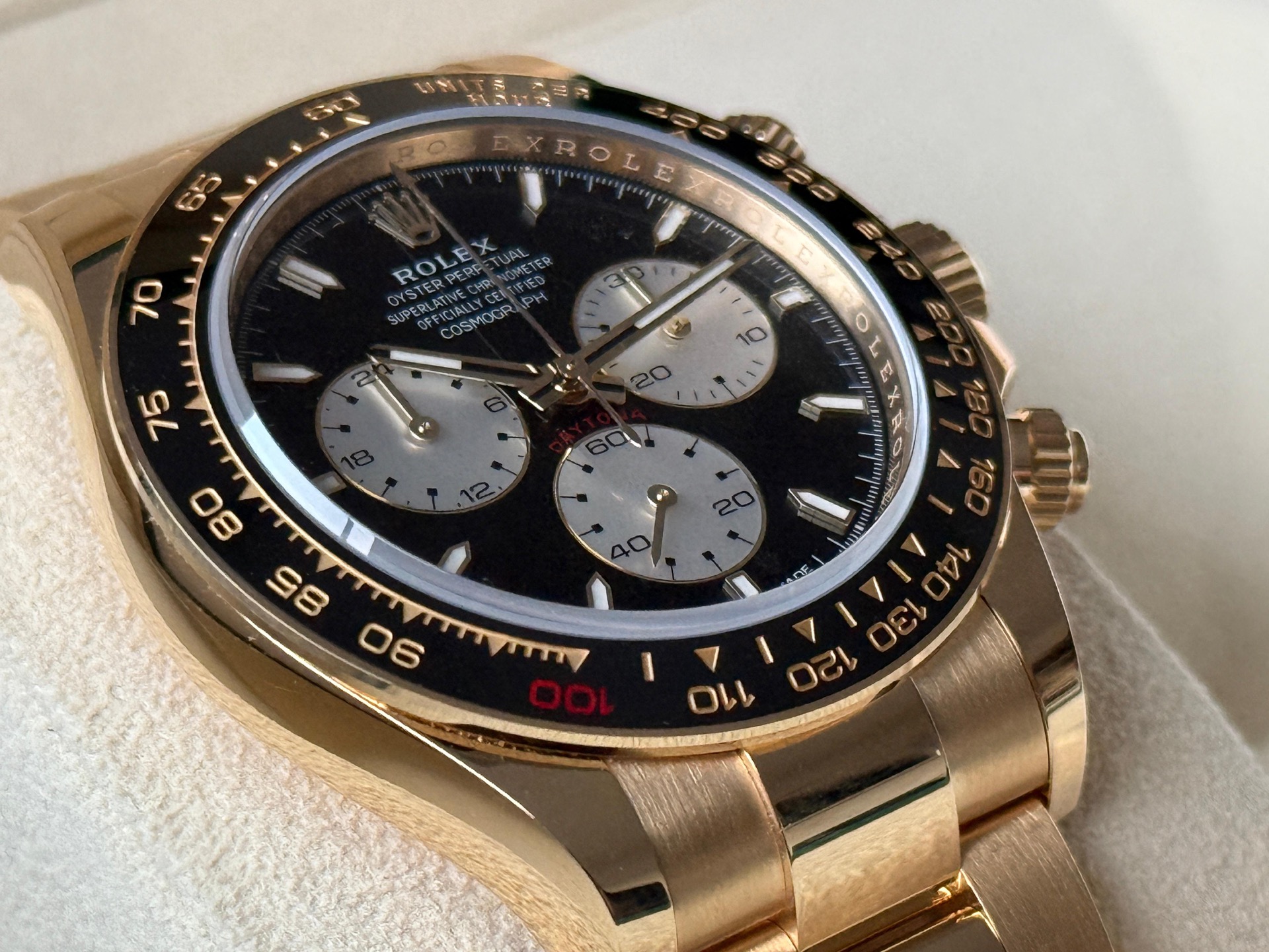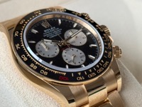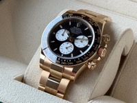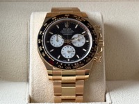 The Rolex Cosmograph Daytona 126528LN is a special edition timepiece introduced in 2024 to commemorate the 100th anniversary of the 24 Hours of Le Mans race. Crafted in 18k yellow gold, this model features a 40mm case paired with a black Cerachrom ceramic bezel. A distinctive red "100" marker at the 1 o'clock position on the bezel highlights the centenary celebration.