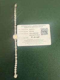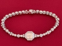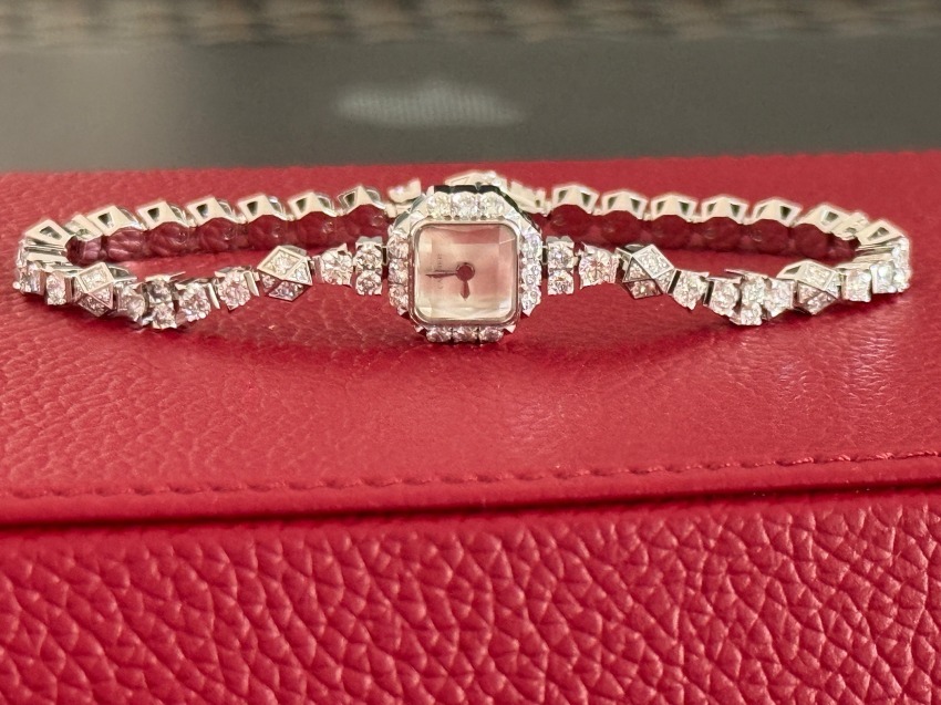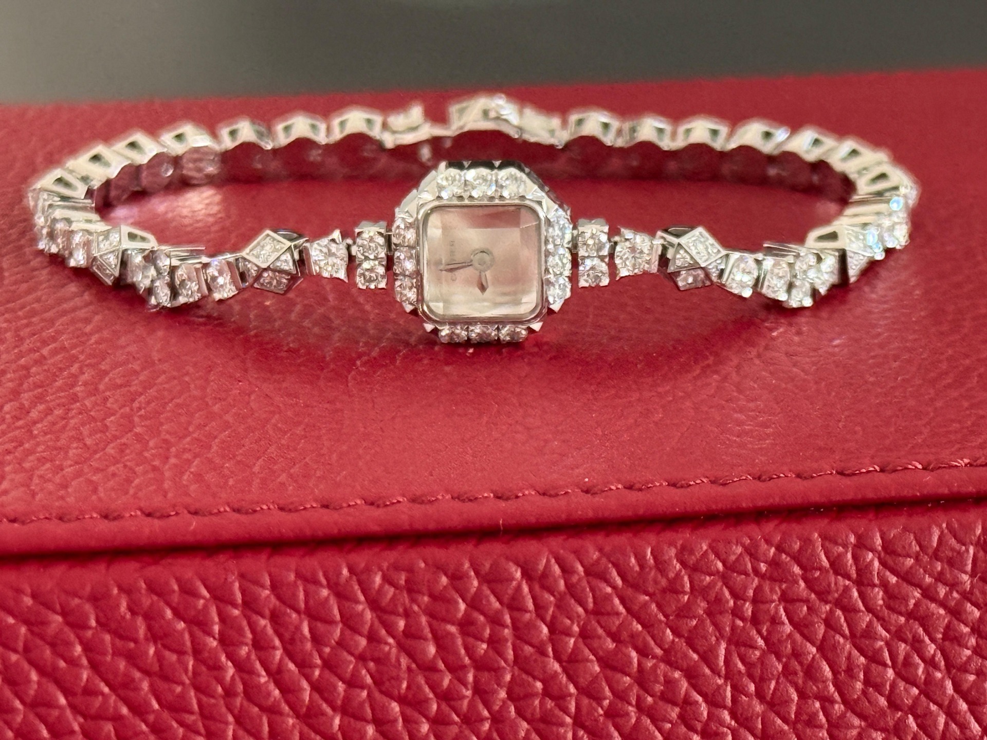 High jewelry watch, quartz movement, 12.9 x 12.9 x 4.7 mm case and 18-karat rhodium-plated (750/1000) white gold bracelet with 118 baguette-cut diamonds totaling 3.2 carats. Translucent lacquered silver dial with sunburst effect, rhodium-plated steel sword hands.