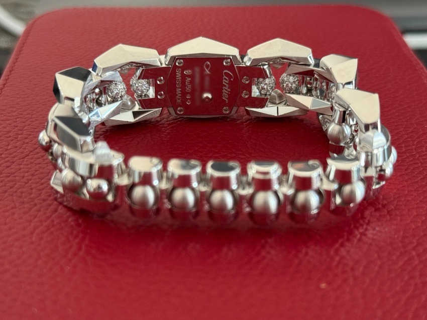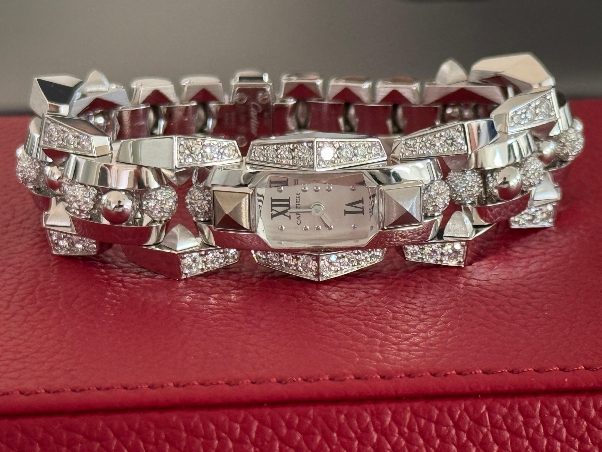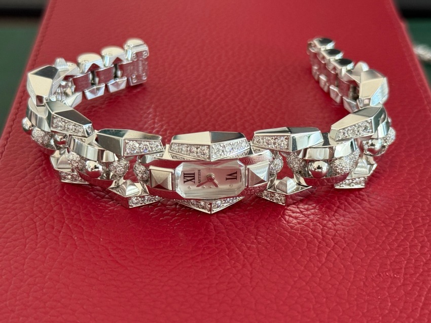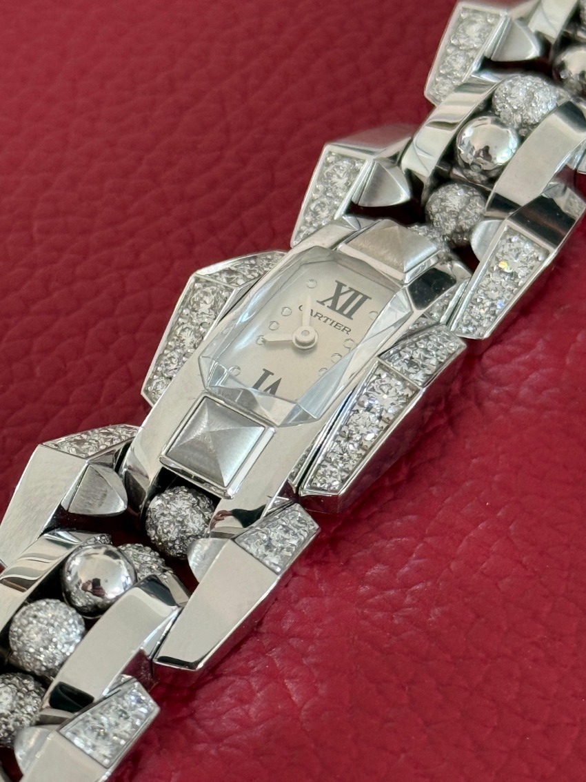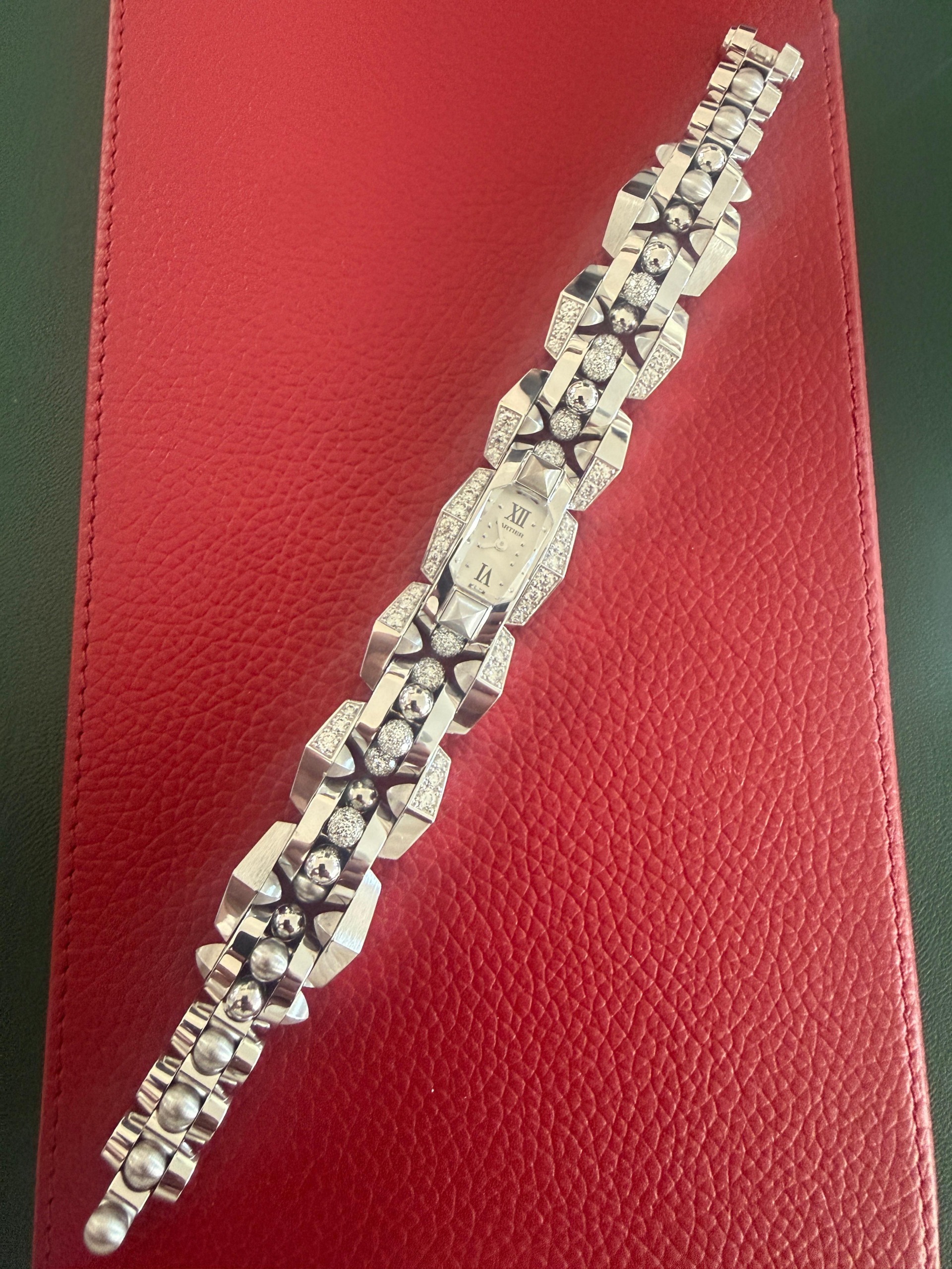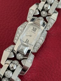 Boîtier de 18,4 x 32,7 x 8,1 mm et bracelet en or blanc et diamants.